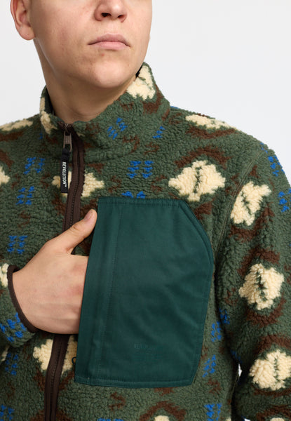 Casaco com estampado gráfico, confecionado em tecido Teddy de poliéster, que garante um elevado nível de aquecimento e respirabilidade. O tecido Teddy é tricotado para simular os pelos de animais, com as fibras orientadas verticalmente, o que proporciona um grande volume de ar retido no tecido e, consequentemente, uma elevada relação isolamento/peso. A estrutura aberta do tecido proporciona uma ótima ventilação e, quando veste algo por cima do casaco Terry, mantém-no quente. Portanto, é também a camada intermédia ideal. O casaco é desenhado com um bolso característico com fecho no peito, em tecido de cor contrastante. As extremidades das mangas são franzidas com um cordão elástico e a bainha inferior ajustável oferece diferentes possibilidades de estilo ao casaco. É a camada ideal para o manter confortável enquanto explora ambientes urbanos.