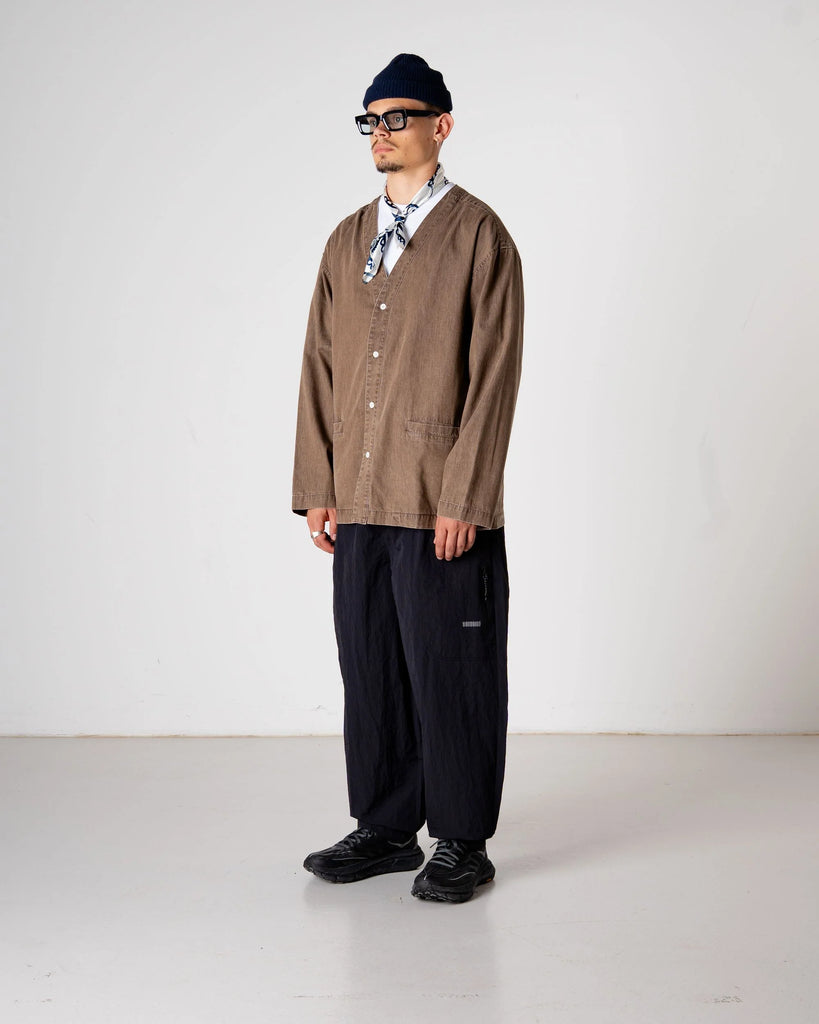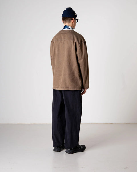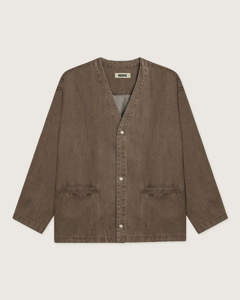 Esta sobrecamisa com decote em V tem um aspeto descontraído e utilitário, com uma silhueta clean e uma textura ligeiramente desbotada. É o tipo de peça que compõe um look discretamente, sem causar alarido.
