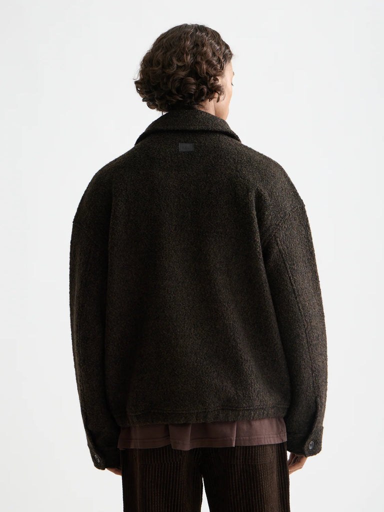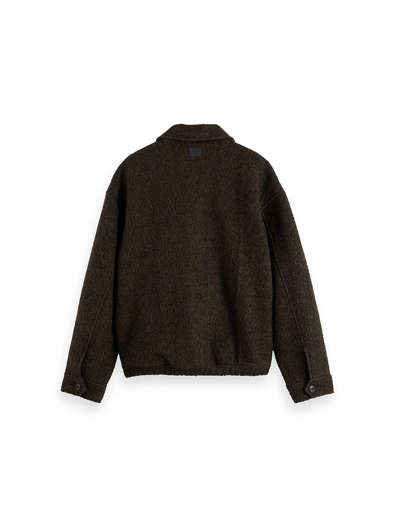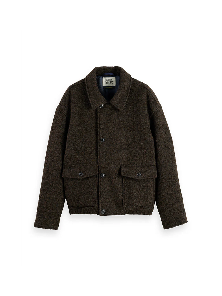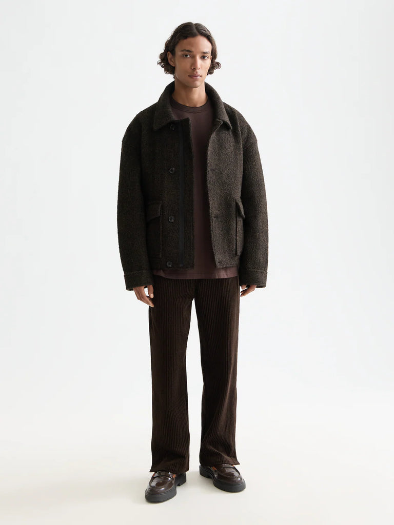 Um casaco curto feito à medida em mistura de lã, oferecendo uma camada exterior elegante e minimalista.