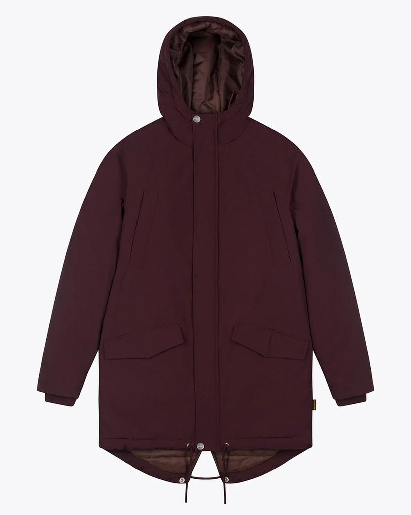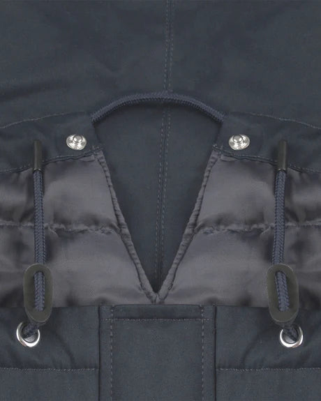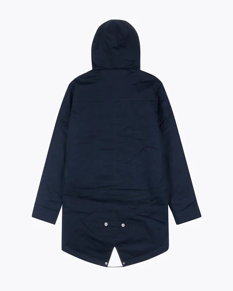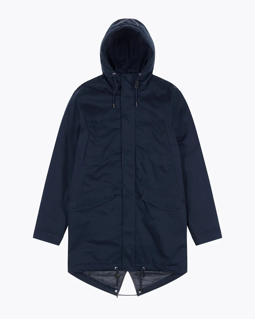 CORDÃO DE NYLON NO CAPUZ E NA BARRA, ACABAMENTO EM RABO DE PEIXE NA PARTE INFERIOR DAS COSTAS