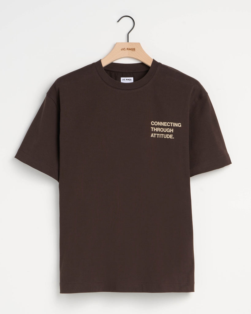 Uma t-shirt oversized de manga curta com um corte confortável. Finalizado com um discreto estampado no peito com o texto "Connecting through attitude" (Conectando-se através da atitude). Uma peça moderna e versátil para o dia a dia.