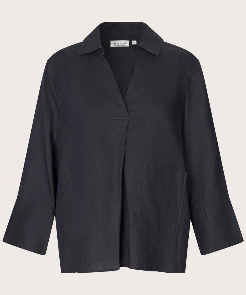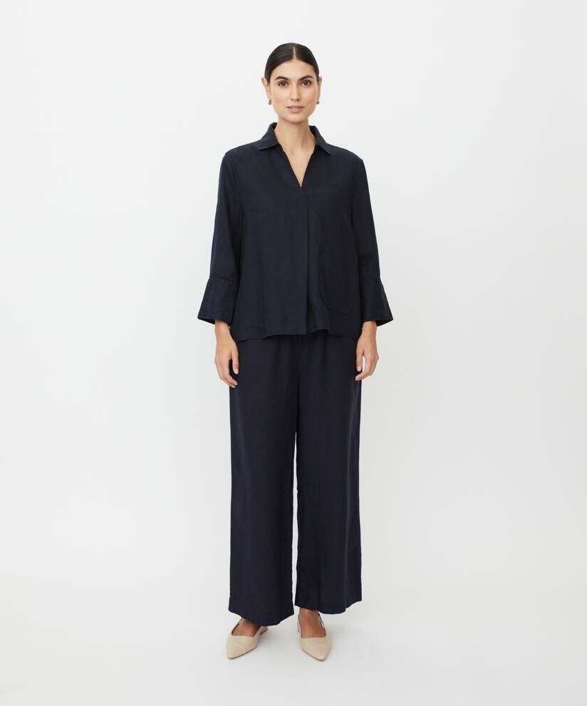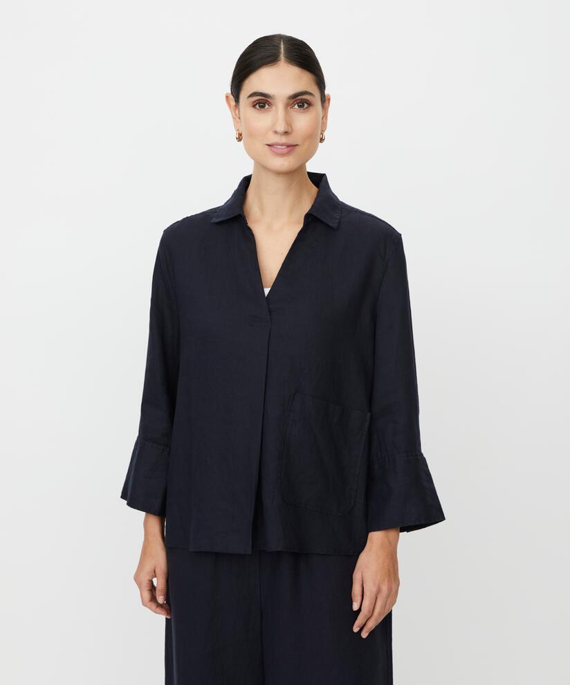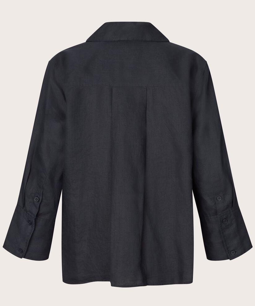 Crie um look feminino e descontraído com esta blusa lisa em 100% linho, que é suave, leve e respirável ao toque. O corte em A permite que a blusa assente de forma bonita e natural sobre o corpo, enquanto as mangas a três quartos com punhos acrescentam um toque despojado. O bolso frontal grande dá um toque decorativo discreto — perfeito para criar um look moderno e descontraído.