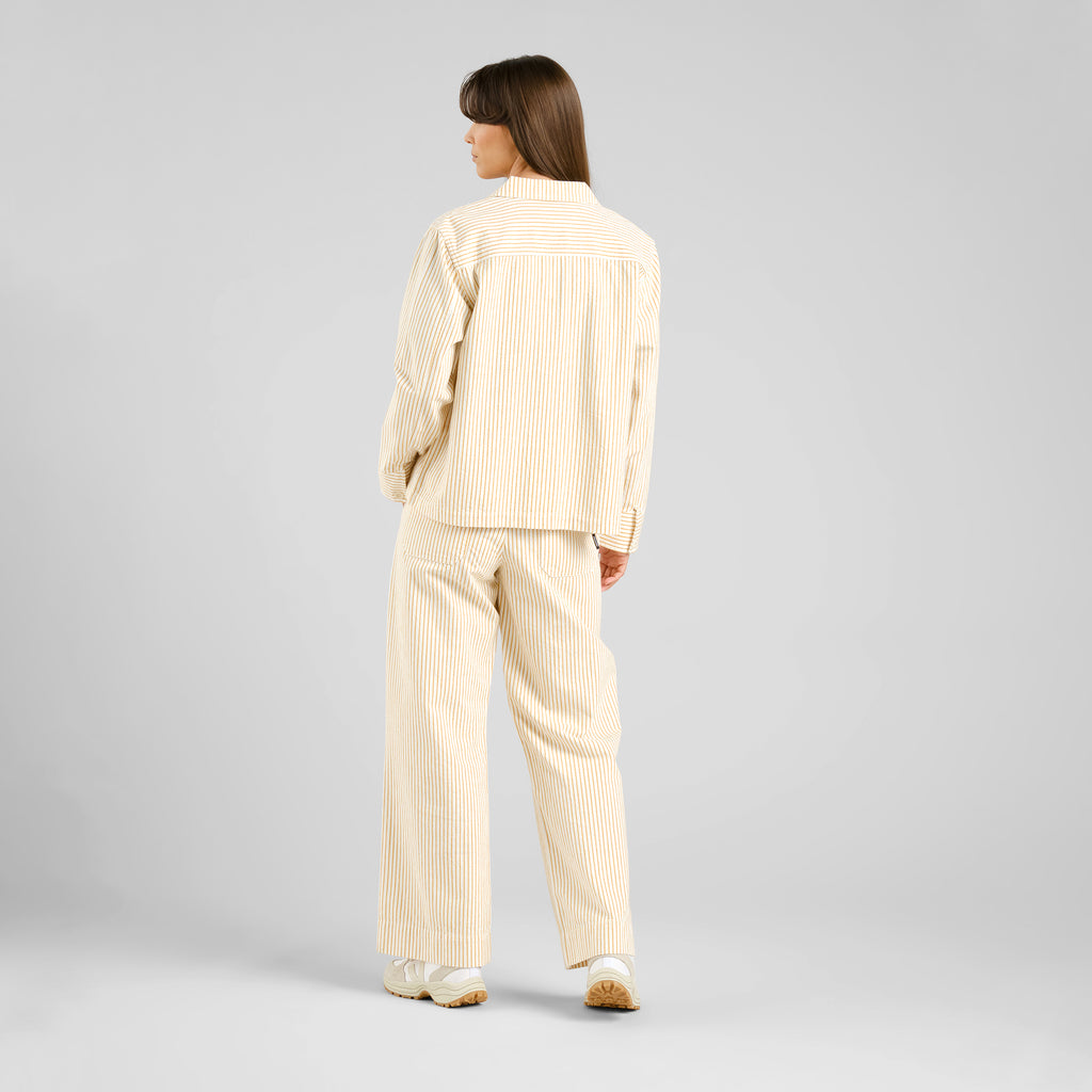 A nossa calça mais popular, a Vara, tem um corte favorecedor que assenta bem em todos os tipos de corpo, com uma cintura subida que se alarga progressivamente nas pernas. Esta versão utilitária oferece mais conforto na anca e na coxa, com pernas direitas e compridas para uma silhueta relaxada e espaçosa. As riscas verticais em amarelo vibrante sobre uma base cru mantêm o aspeto clean e com inspiração utilitária. Fabricada em lona de algodão orgânico resistente e respirável, com fibras cultivadas organicamente para uma opção de menor impacto ambiental. Conjugue com o blusão da mesma linha e uma t-shirt justa, ou mantenha um look casual com uns ténis e uma camisa por dentro das calças.