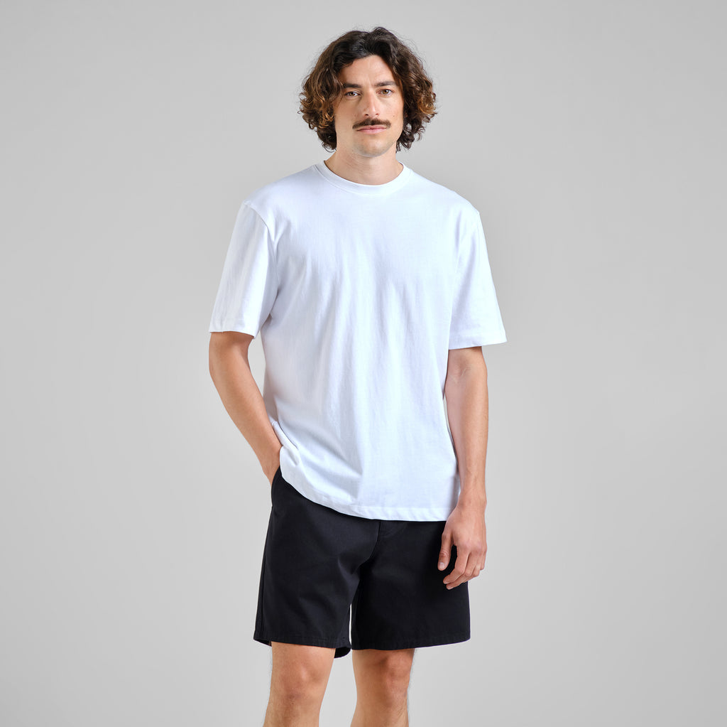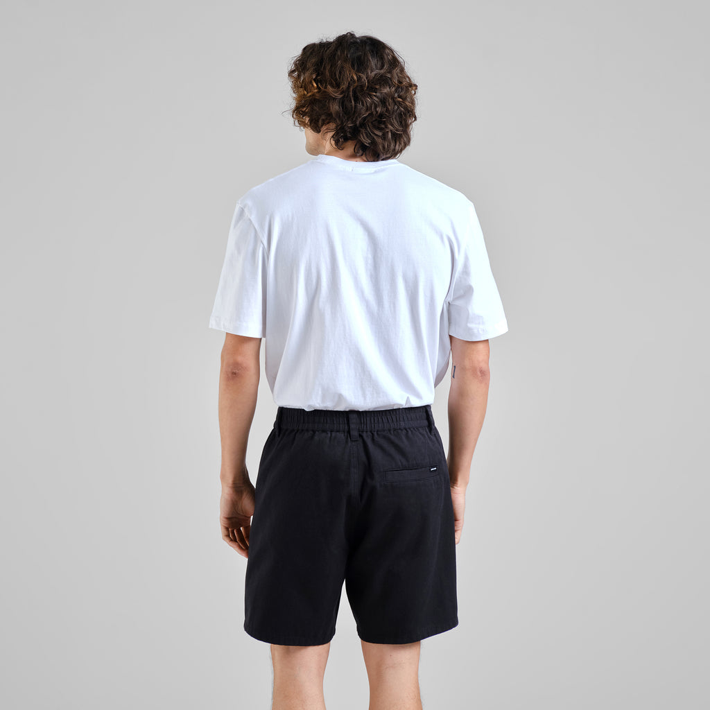 Calções chino de corte ligeiramente folgado. Cintura média com perna direita e confortável, acima do joelho, para uma silhueta descontraída. Cós elástico para maior conforto com passadores para cinto, mantendo o look clássico do chino. Fecho com fecho e botão. Bolsos laterais e um bolso traseiro incorporado para maior praticidade. Cor preta lisa (Caviar) para combinações fáceis. Fabricado em sarja de algodão orgânico com certificação GOTS, que apoia o cultivo sustentável do algodão. Use com uma t-shirt branca e ténis para o dia a dia ou com uma camisa de manga curta e sandálias para as noites mais quentes.